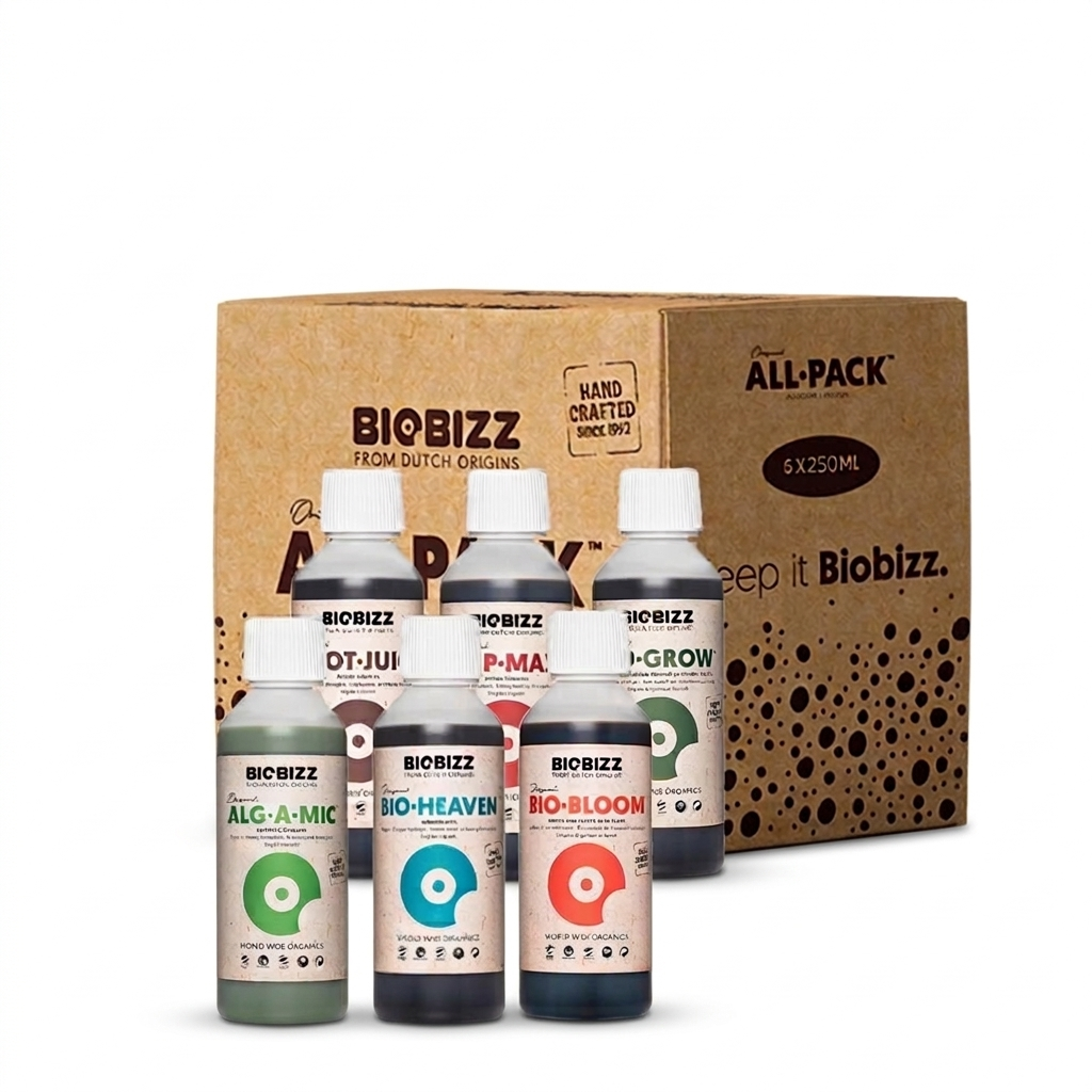 O novo Biobizz All·Pack Indoor de 250 ml é a maneira perfeita de explorar o ecossistema Biobizz: seis nutrientes e estimulantes orgânicos essenciais que nutrem suas plantas em todas as fases de crescimento, tudo em uma caixa prática.